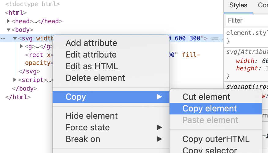 One important thing I almost forgot! You've now generated some fantastic SVG code, but how do you get it out? I really had no more time to display the DOM string, so I just did it the simplest way possible: copy-paste the generated SVG from the site's source code: