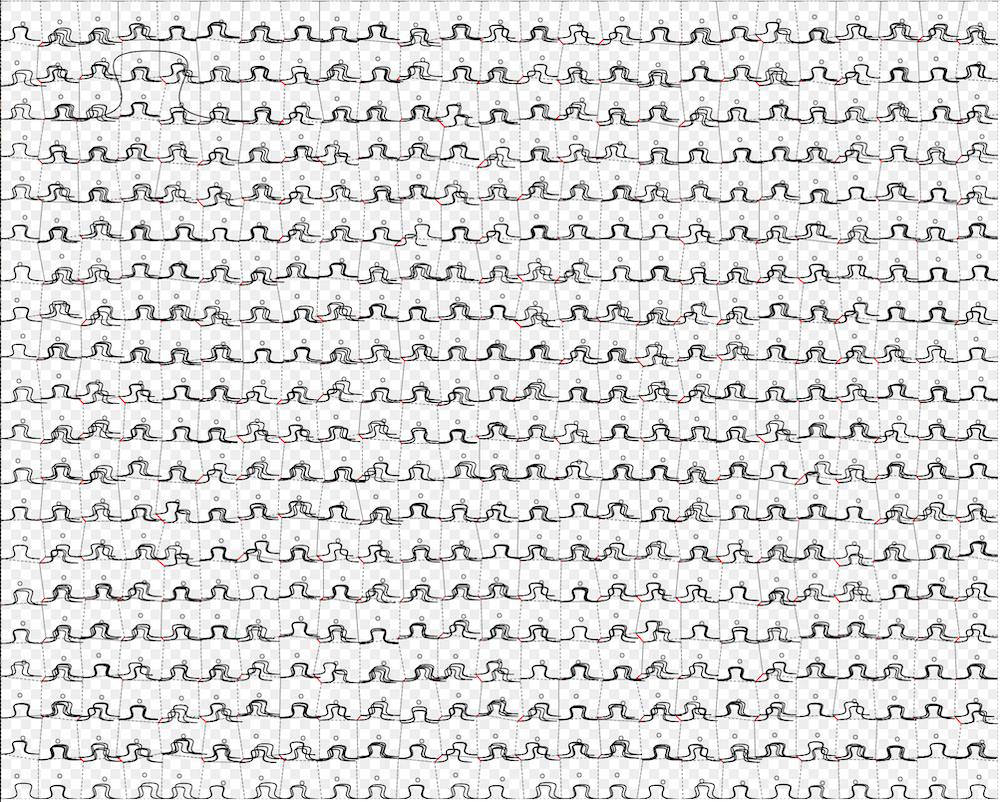 One problem was how the paths in the generated svg were laid out. In particular, the first time I went to cut out my puzzles, I learned that the algorithm to generate the cutting path is not particularily fancy. If you've ever looked at the source code for an SVG file, you've noticed that it's just a bunch nested of XML elements, which describe the rectangles, circles, Bézier curves, and other shapes.